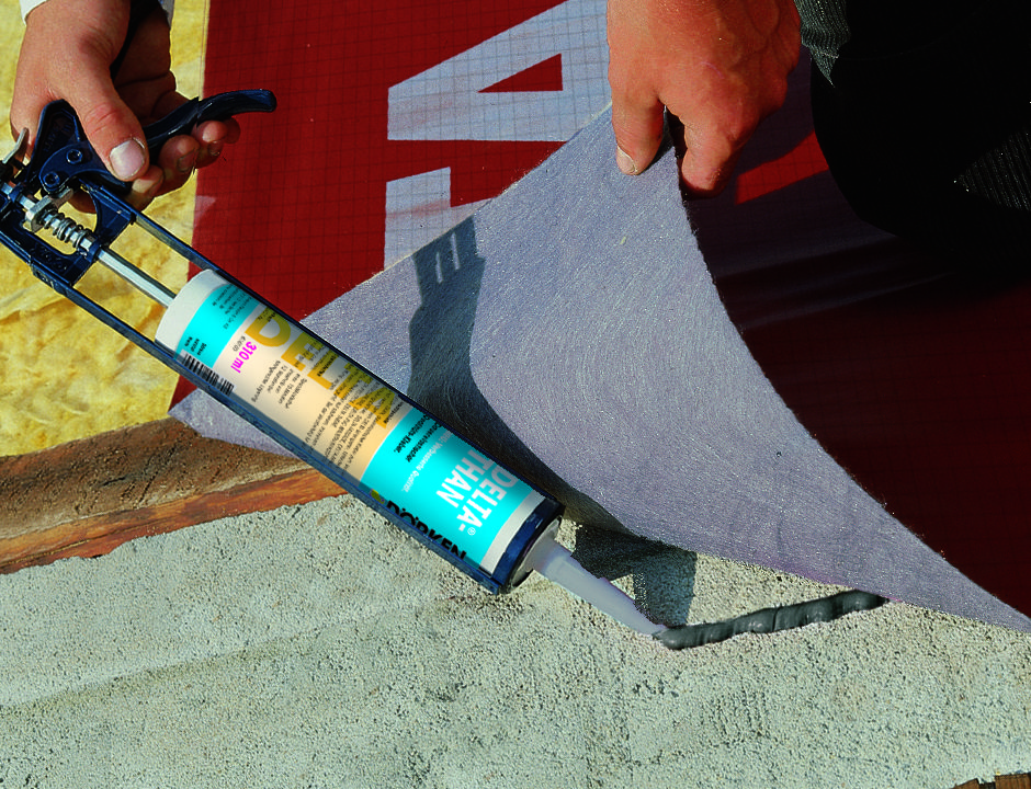 Клей для герметичного воздухо- и водонепроницаемого соединения любых подкровельных плёнок DELTA® с кирпичной кладкой, штукатуркой, металлическими, пластиковыми и деревянными элементами крыши. Наносить клей в виде непрерывного жгута диаметром 8 мм. Допускается использование с элементами из не строганной древесины. Не следует применять на основаниях из полистирола.